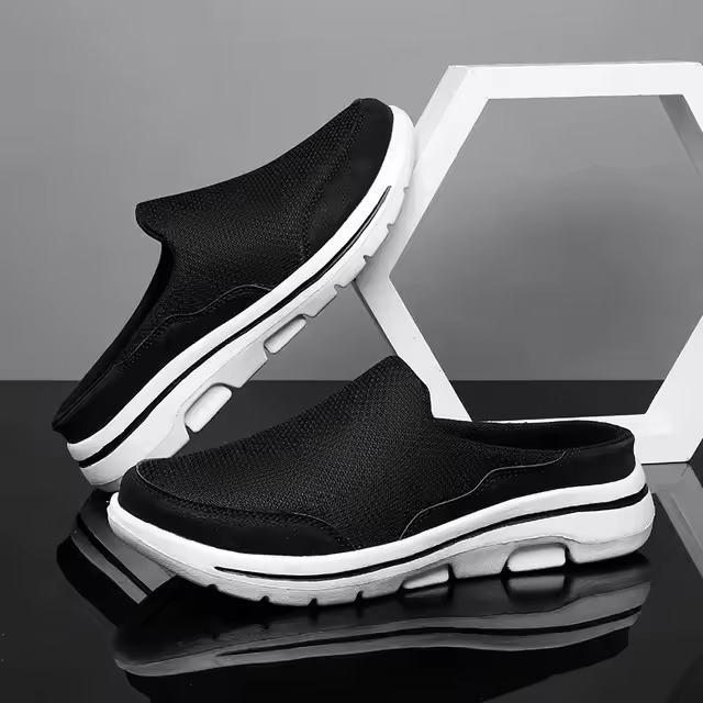 Men's mesh toe half slippers are a type of footwear designed for casual wear. They typically have a breathable mesh upper that allows for ventilation and helps keep feet cool and dry. The toe of the slipper is exposed, providing a comfortable and convenient way to slide them on and off. The half design refers to the fact that the slipper does not cover the entire foot, leaving the heel exposed. These slippers may also have a flexible and durable sole for added comfort and support.